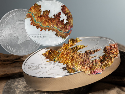 Серебряная монета Островов Кука дополнит серию «Topography». На её реверсе в цвете приведён фрагмент физической карты мира, описывающей рельеф Большого каньона, где по рыжему цвету, изображающему горы, тянется извилистая изумрудная нить реки Колорадо. На оставшейся части монетного поля отчеканены границы и названия территорий, прилегающих к этому грандиозному объекту. Это не первая монета с Великим каньоном: достаточно вспомнить 25 центов США 2010 года «Национальный парк Гранд Каньон». Однако той маленькой памятно-оборотной монетке далеко по размерам до этого серебряного гиганта. К тому же, коллекционная монета детально воссоздаёт рельеф Великого каньона.