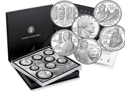 Монеты США не всегда чеканились из цветных сплавов. На заре зарождения американский доллар и несколько разменных монет были серебряными, а на выпуск более крупных номиналов шло золото. Как и большинство других стран, США отказались от использования чеканки обиходных монет из драгоценных металлов. Четвертаки (25 центов) и даймы (10 центов) до 1965 года на 90% состояли из чистого серебра. Последним серебряным номиналом для обращения оставались полдоллара, чеканку которых на медно-никель перевели в 1971 году. Но в память о былых временах продолжают выходить коллекционные наборы погодовки, чьи монеты по-прежнему чеканятся из серебра. Подобный набор монет США, куда вошли все квотеры серии «Американские женщины» (American Women Quarters) с датой «2024», появился в продаже 5 ноября.