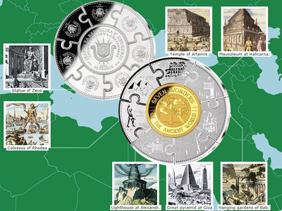 Монеты «Семь чудес античного мира» Республики Бурунди предстают не набором, а единым предметом с восьмисантиметровым диаметром. Его центром стали 25 франков из позолоченного серебра весом 38,8 грамма. Остальным монетам позолоты не досталось. Они идентичны, имея форму элемента пазла, номинал 10 франков и вес 16,67 грамма. Аверс содержит официальный герб страны – три копья, закрытые щитом со львиной мордой (до 1962 на нём ещё была изображена птица журавль). На реверсе каждой из них представлено одно из чудес Древнего мира, а 25 франков показывают миниатюрную карту с их расположением. Чеканка серии произведена в коллекционном качестве proof-like, а небольшой тираж (250 штук) должен подстегнуть интерес к покупке.