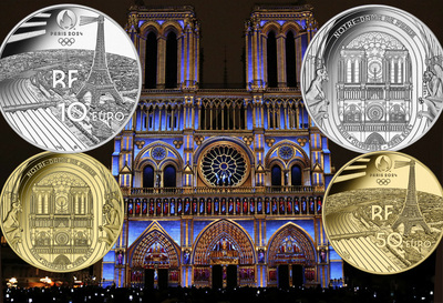 Чтобы познакомить олимпийцев и гостей с достопримечательностями Парижа, ряд соревнований пройдёт в его центре. Даже на Елисейских полях и Марсовом поле возведут временные объекты. Не останется в стороне и знаменитый Собор Парижской Богоматери. По туристической популярности он уступает разве что Эйфелевой башне. Собор Нотр-Дам-де-Пари схож с птицей Феникс, сгорающей и возрождающейся из собственного пепла. До него на этом месте находилось четыре культовых сооружения, а обломки последнего пошли на возведение храма. Строили его почти два столетия, но привычный нам облик он получил лишь во время реставрации XIX века (в частности, тогда появились знаменитые химеры). На монетах ему появляться не впервой. Не будем вспоминать выпуски экзотических стран, но в тех же металлах, весе и номиналах отчеканена мини-серия «850 лет Собору Парижской Богоматери», где помимо самого собора запечатлены фрагменты его витражей. Новая монета «Нотр-Дам-де-Пари», показывает фасад здания крупным планом, на который любуется пара химер.