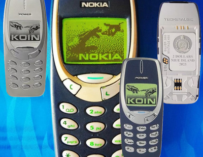 Монета Ниуэ 2 доллара напоминает уменьшенную копию знаменитого аппарата. Её аверс имитирует телефон со снятой крышкой, чтобы мы могли увидеть, как он устроен. Вниманию зрителей предстаёт посадочное место для SIM-карты и элементы печатных плат. Легенда монеты (номинал, год выпуска и пр.) отчеканена на «аккумуляторе». Оборот монеты копирует панель с кнопками и экран, на котором кроме логотипа, где наименование финской компании заменено на KOIN, показан фрагмент самой известной фрески с потолка Сикстинской капеллы – «Сотворение Адама». Цветной вариант монеты смотрится интереснее, ведь здесь «корпус» имеет фирменный синий цвет, а окраска экрана дарит иллюзию, что «телефон» активен.