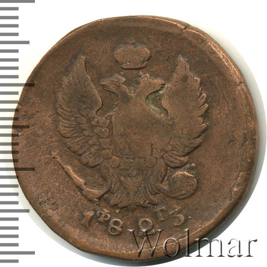 В центре изображен Государственный Герб Российской империи - двуглавый орёл с поднятыми вверх распущенными крыльями. Головы которого увенчаны двумя коронами, третья, большая корона над ними. На груди орла расположен Московский герб - щит с изображением Георгия Победоносца, поражающего копьем дракона. Вокруг щита орденская цепь с орденом Св. Апостола Андрея Первозванного. В правой лапе орла – скипетр, в левой – держава. Под правой лапой – буква «Ф», под левой – буква «Г». Инициалы минцмейстера Франца Германа. Под инициалами — дата выпуска монеты «1823». По окружности канта имеются рельефные элементы, выполненные в виде точек.