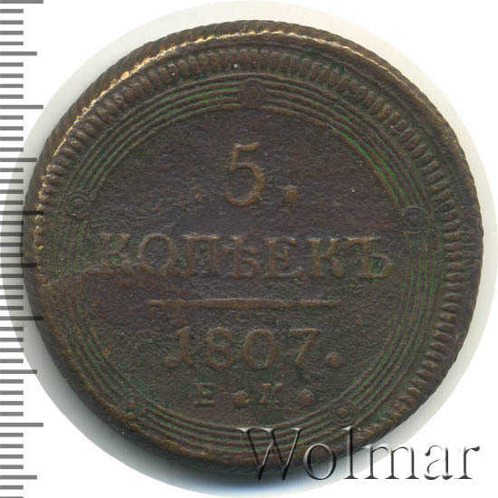 В центре надпись — слово «КОПЕЕКЪ». Над надписью — цифра «5.». Под надписью — фигурная черта, под ней — дата выпуска монеты «1807.». Под датой обозначение Екатеринбургского монетного двора — буквы "ЕМ". Одна над цифрой, две по сторонам надписи, а также слева и справа от обозначения монетного двора, равномерно расположены счётные знаки пяти копеек — пять окантованных точек, размещенных на пятилинейном ободке, проходящем вдоль канта. По окружности канта имеются рельефные элементы, выполненные в виде зубцов.