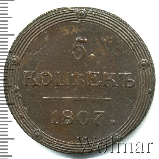 В центре надпись — слово «КОПЕЕКЪ». Над надписью — цифра «5.». Под надписью — фигурная черта, под ней — дата выпуска монеты «1807.». Одна над цифрой, две по сторонам надписи и две под датой, равномерно расположены счётные знаки пяти копеек — пять окантованных точек, размещенных на пятилинейном ободке, проходящем вдоль канта.