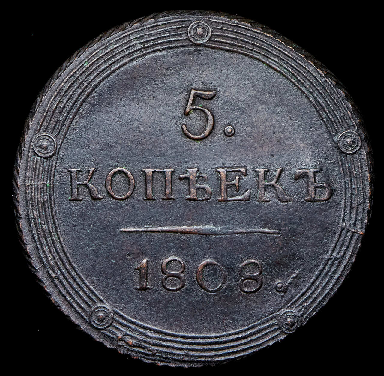 В центре надпись — слово «КОПЕЕКЪ». Над надписью — цифра «5.». Под надписью — фигурная черта, под ней — дата выпуска монеты «1808.». Одна над цифрой, две по сторонам надписи и две под датой, равномерно расположены счётные знаки пяти копеек — пять окантованных точек, размещенных на пятилинейном ободке, проходящем вдоль канта.