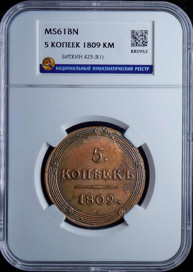 5 копеек 1809 (в слабе)буквы КМ Аукцион: AdaCoins Online Состояние: MS 61 BN | 09.10.2025 |