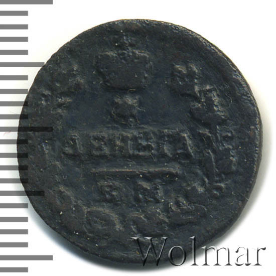 В центре указан номинал - надпись «ДЕНЬГА». Над обозначением номинала - шестиконечная звезда. Над ней - императорская корона. Под надписью - прямая черта, под ней - обозначение монетного двора «Е.М.». Вдоль канта, не доходя до короны, изображен венок из лавровой и дубовой ветви, которые в нижней части переплетены лентой. По окружности канта имеются рельефные элементы, выполненные в виде точек.