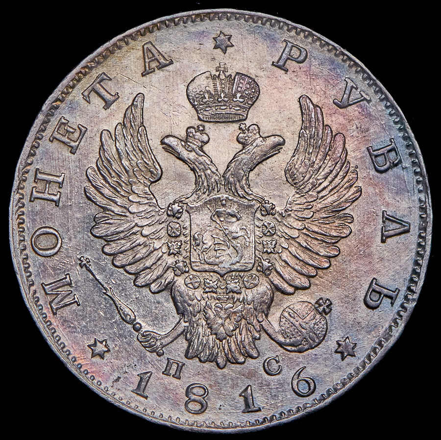 Аверс монеты 1 рубль 1816 года СПБ-ПС скипетр длиннее