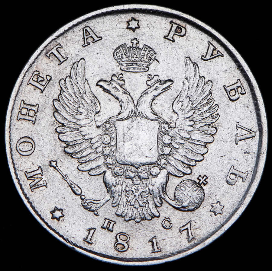 Аверс монеты 1 рубль 1817 года СПБ-ПС скипетр короче