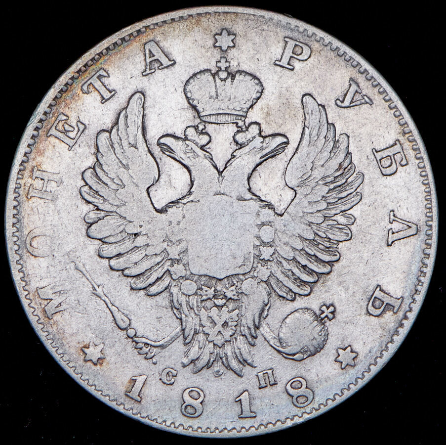 В центре изображен Государственный Герб Российской империи - двуглавый орёл с поднятыми вверх распущенными крыльями. Головы которого увенчаны двумя коронами, третья, большая корона над ними. На груди орла расположен Московский герб - щит с изображением Георгия Победоносца, поражающего копьем дракона. Вокруг щита орденская цепь с орденом Св. Апостола Андрея Первозванного. В правой лапе орла – скипетр, в левой – держава. Под правой лапой – буква «С», под левой – буква «П». Инициалы минцмейстера Павла Ступицына. Слева от герба круговая надпись - «МОНЕТА», справа - «РУБЛЬ». Под инициалами — дата выпуска монеты «1818». Все три надписи разделены между собой тремя шестиконечными звёздами. По окружности канта имеются рельефные элементы, выполненные в виде зубцов.