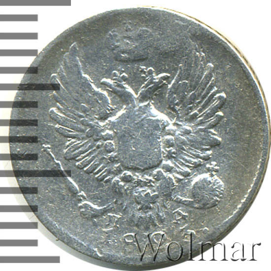 В центре изображен Государственный Герб Российской империи - двуглавый орёл с поднятыми вверх распущенными крыльями. Головы которого увенчаны двумя коронами, третья, большая корона над ними. На груди орла расположен Московский герб - щит с изображением Георгия Победоносца, поражающего копьем дракона. Вокруг щита орденская цепь с орденом Св. Апостола Андрея Первозванного. В правой лапе орла – скипетр, в левой – держава. Под правой лапой – буква «П», под левой – буква «Д». Инициалы минцмейстера Павла Данилова. Под инициалами — дата выпуска монеты «1823.». По окружности канта имеются рельефные элементы, выполненные в виде зубцов.