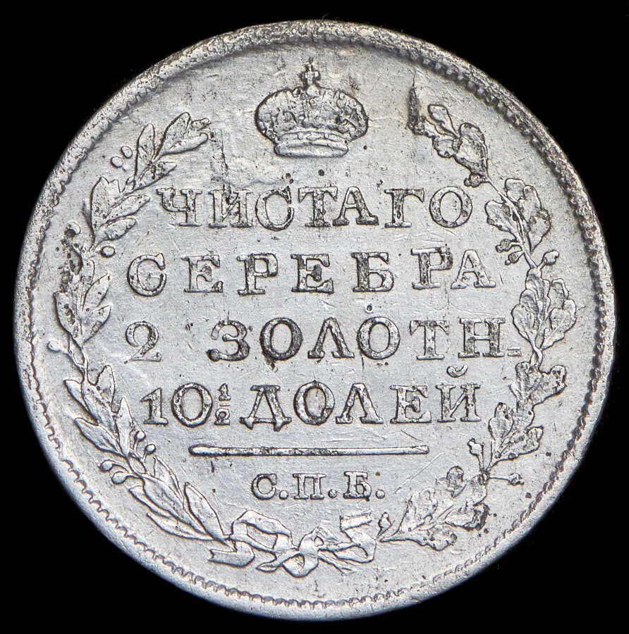 Реверс монеты полтина 1821 года СПБ-ПД корона широкая
