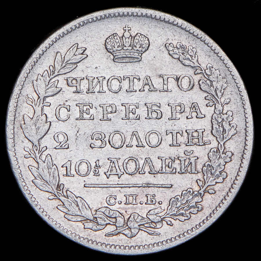 Реверс монеты полтина 1825 года СПБ-ПД корона узкая