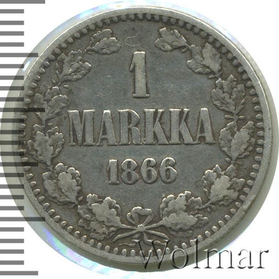 В центре - надпись в три строки: «1»│«MARKAA»│«1866». Вдоль канта изображён не замкнутый венок из двух дубовых ветвей, которые, в нижней части, перевязаны лентой на узел двойным бантом. По окружности канта имеются рельефные элементы, выполненные в виде зубцов.