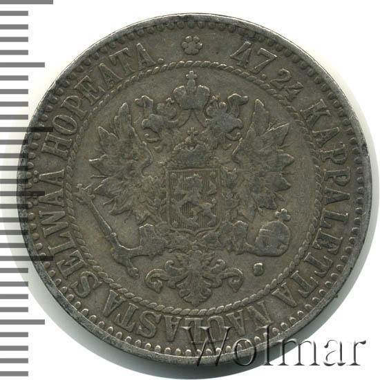 В центре изображён полный Герб Великого княжества Финляндского - двуглавый орёл, головы которого увенчаны двумя коронами, третья, большая корона над ними. Все они соединены орденской лентой ордена Св. Апостола Андрея Первозванного. На груди орла расположен щит с титульным гербом Великого князя Финляндского, увенчанный княжеской короной. Вокруг щита орденская цепь с орденом Св. Апостола Андрея Первозванного. В правой лапе орла – скипетр, в левой – держава. Под левой лапой знак директора Гельсингфосского монетного двора - литера «S», August Frederick Soldan (Август Фридрих Сольдан). Вокруг центрального изображения - витой ободок. За ободком круговая надпись: «47.24 KAPPALETTA NAULASTA SELWÄÄ HOPEATA», сверху разделённая цветочной розеткой. По окружности канта имеются рельефные элементы, выполненные в виде зубцов.