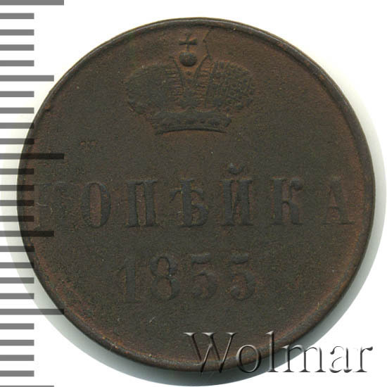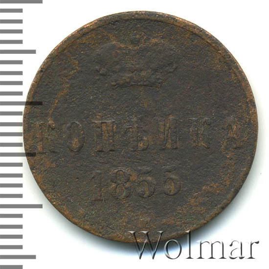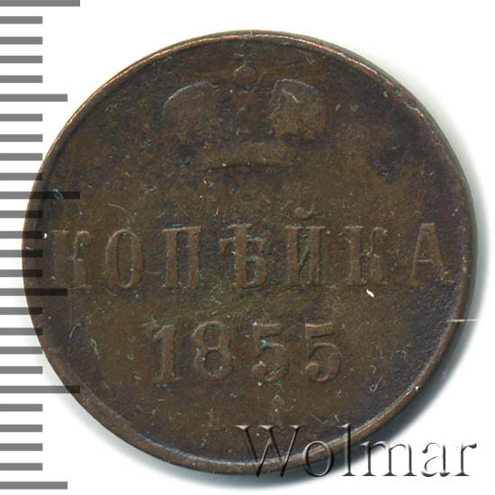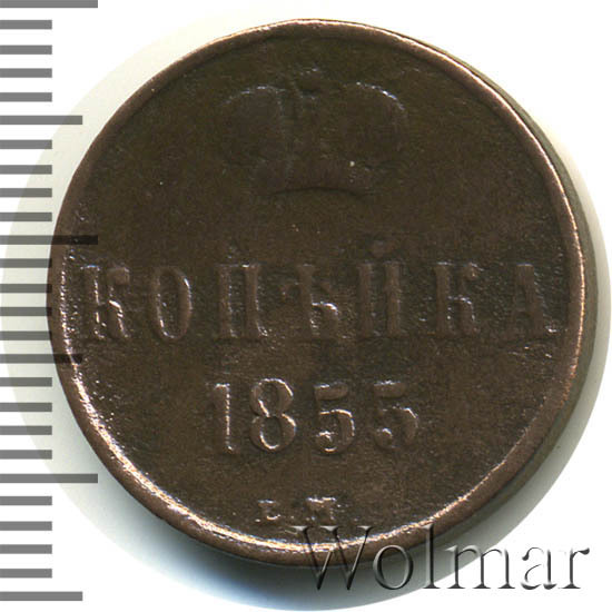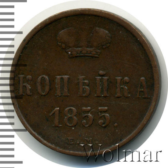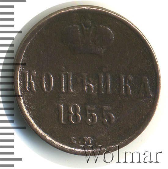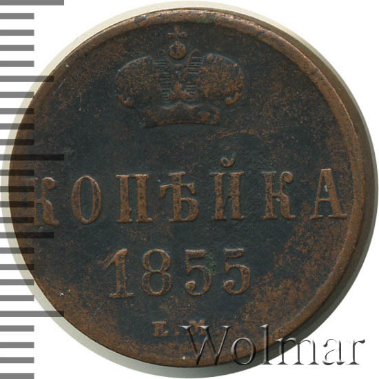 В центе обозначение номинала — слово «КОПЕЙКА». Выше номинала - Корона Российской империи. Ниже номинала — год выпуска монеты «1855.» и под годом - обозначение монетного двора буквы «Е.М.».