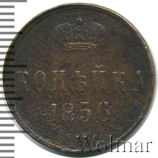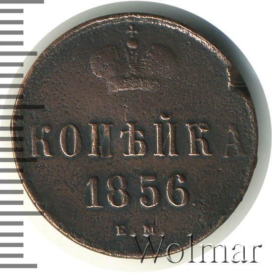 В центе обозначение номинала — слово «КОПЕЙКА». Выше номинала - Корона Российской империи. Ниже номинала — год выпуска монеты «1856.» и под годом - обозначение монетного двора буквы «Е.М.».