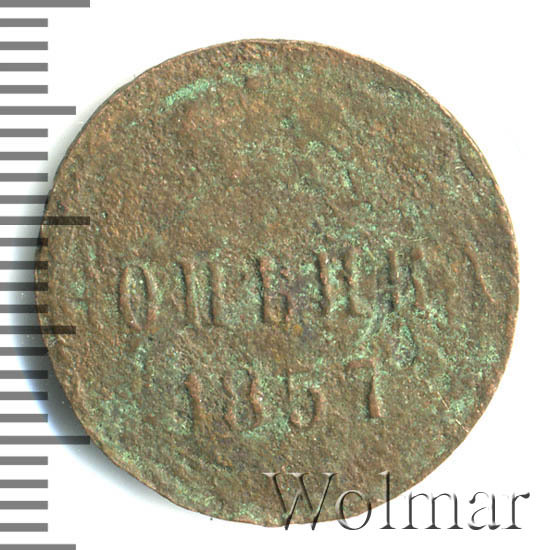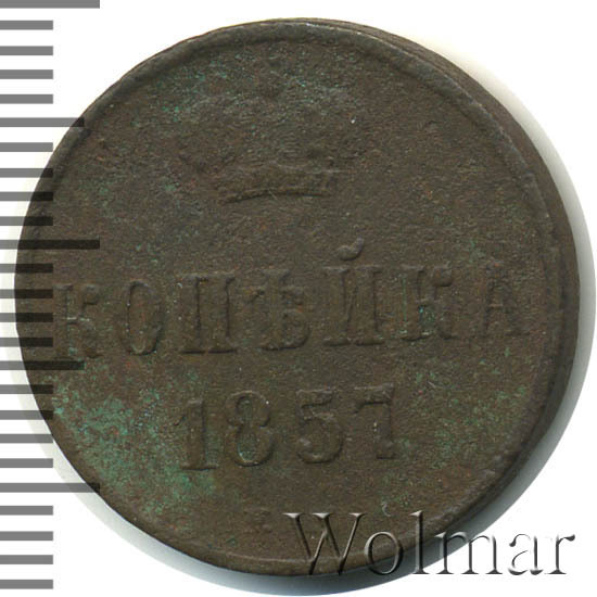 В центе обозначение номинала — слово «КОПЕЙКА». Выше номинала - Корона Российской империи. Ниже номинала — год выпуска монеты «1857.» и под годом - обозначение монетного двора буквы «Е.М.».