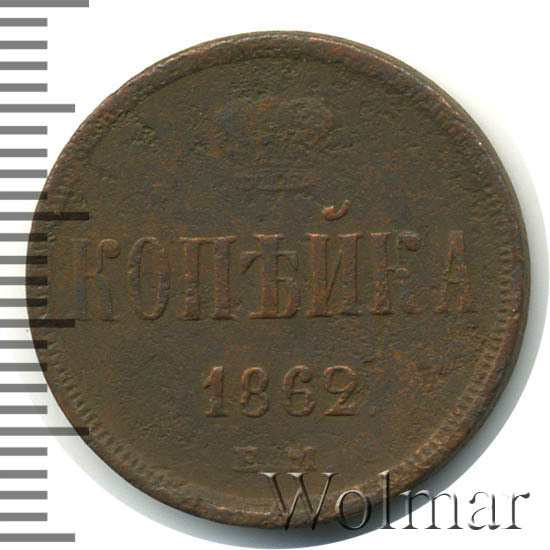 В центе обозначение номинала - слово «КОПЕЙКА». Выше - Корона Российской империи. Ниже - год выпуска монеты «1862.» и под годом - обозначение монетного двора буквы «Е.М.».