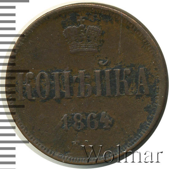 В центе обозначение номинала - слово «КОПЕЙКА». Выше - Корона Российской империи. Ниже - год выпуска монеты «1864.» и под годом - обозначение монетного двора буквы «Е.М.».