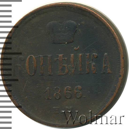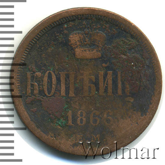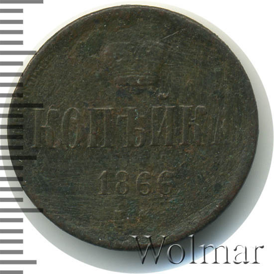 В центе обозначение номинала - слово «КОПЕЙКА». Выше - Корона Российской империи. Ниже - год выпуска монеты «1866.» и под годом - обозначение монетного двора буквы «Е.М.».