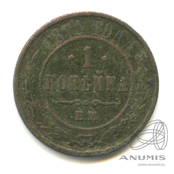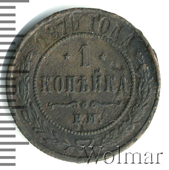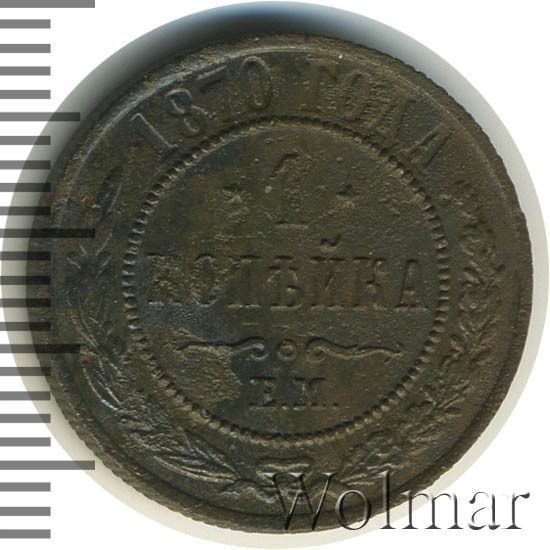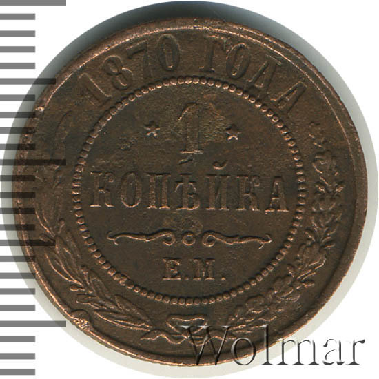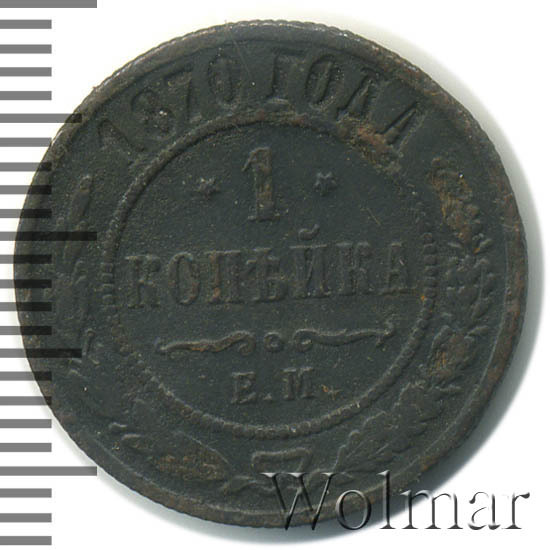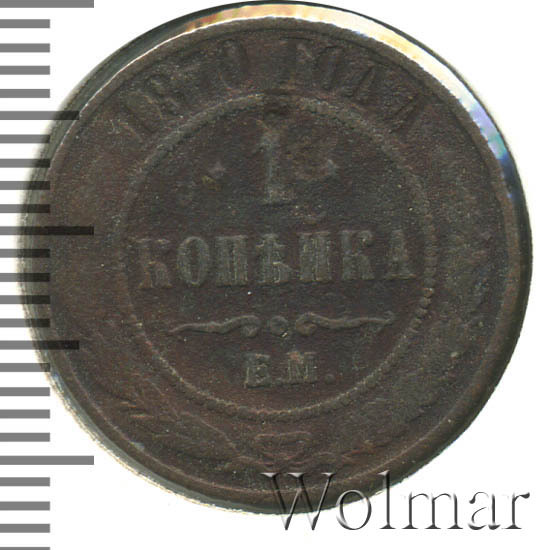 В центре указан номинал «1», ограниченный с обеих сторон звездочками. Под цифрой номинала слово — "КОПЕЙКА". Ниже, расположен декоративный разделитель в виде двух изогнутых линий и небольшой окружности между ними. Под линиями обозначение монетного двора «Е.М.». Центральная часть отделена от остального изображения, окружностью в виде точек. В верхней части по кругу углубленная надпись: "1870 ГОДА". Ниже этой надписи, вдоль канта, изображен венок из лавровой и дубовой ветви, которые в нижней части перевязаны лентой на узел бантом.