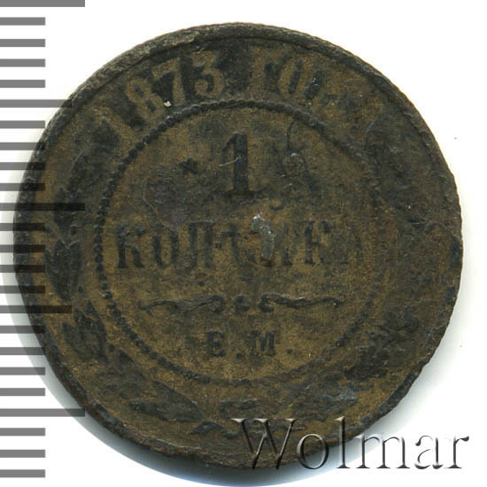 В центре указан номинал «1», ограниченный с обеих сторон звездочками. Под цифрой номинала слово — "КОПЕЙКА". Ниже, расположен декоративный разделитель в виде двух изогнутых линий и небольшой окружности между ними. Под линиями обозначение монетного двора «Е.М.». Центральная часть отделена от остального изображения, окружностью в виде точек. В верхней части по кругу углубленная надпись: "1873 ГОДА". Ниже этой надписи, вдоль канта, изображен венок из лавровой и дубовой ветви, которые в нижней части перевязаны лентой на узел бантом.