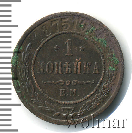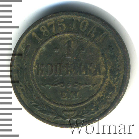 В центре указан номинал «1», ограниченный с обеих сторон звездочками. Под цифрой номинала слово — "КОПЕЙКА". Ниже, расположен декоративный разделитель в виде двух изогнутых линий и небольшой окружности между ними. Под линиями обозначение монетного двора «Е.М.». Центральная часть отделена от остального изображения, окружностью в виде точек. В верхней части по кругу углубленная надпись: "1875 ГОДА". Ниже этой надписи, вдоль канта, изображен венок из лавровой и дубовой ветви, которые в нижней части перевязаны лентой на узел бантом.