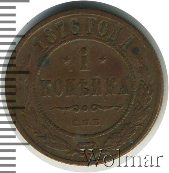 В центре указан номинал «1», ограниченный с обеих сторон звездочками. Под цифрой номинала слово — "КОПЕЙКА". Ниже, расположен декоративный разделитель в виде двух изогнутых линий и небольшой окружности между ними. Под линиями обозначение монетного двора «С.П.Б.». Центральная часть отделена от остального изображения, окружностью в виде точек. В верхней части по кругу углубленная надпись: "1876 ГОДА". Ниже этой надписи, вдоль канта, изображен венок из лавровой и дубовой ветви, которые в нижней части перевязаны лентой на узел бантом.
