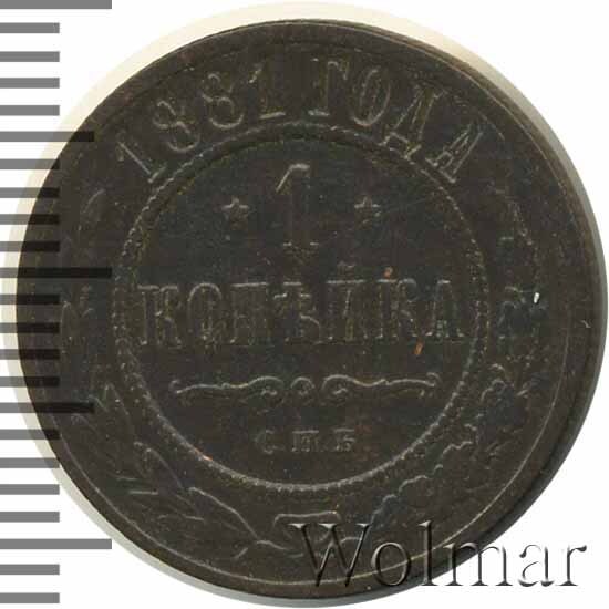 В центре указан номинал «1», ограниченный с обеих сторон звездочками. Под цифрой номинала слово — "КОПЕЙКА". Ниже, расположен декоративный разделитель в виде двух изогнутых линий и небольшой окружности между ними. Под линиями обозначение монетного двора «С.П.Б.». Центральная часть отделена от остального изображения, окружностью в виде точек. В верхней части по кругу углубленная надпись: "1881 ГОДА". Ниже этой надписи, вдоль канта, изображен венок из лавровой и дубовой ветви, которые в нижней части перевязаны лентой на узел бантом.