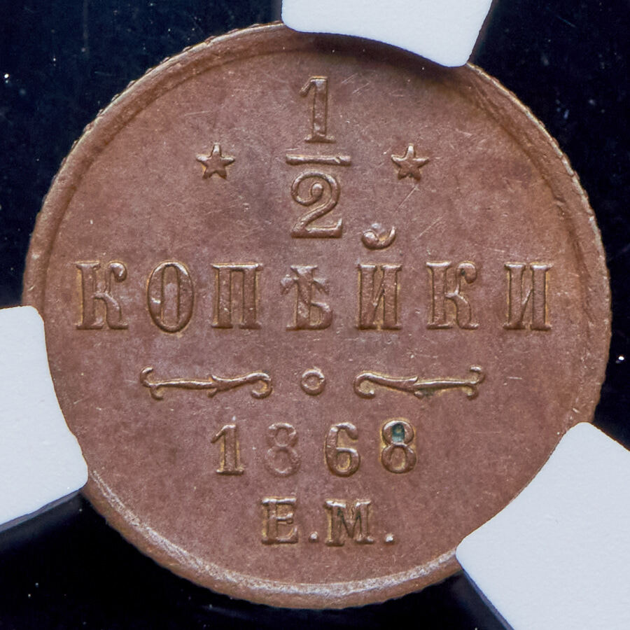 В центре указан номинал «1/2», ограниченный с обеих сторон звездочками. Под цифрой номинала слово — "КОПЕЙКИ". Ниже, расположен декоративный разделитель в виде двух изогнутых линий и небольшой окружности между ними. Под линиями год выпуска монеты "1868" и под ним обозначение монетного двора «Е.М.».