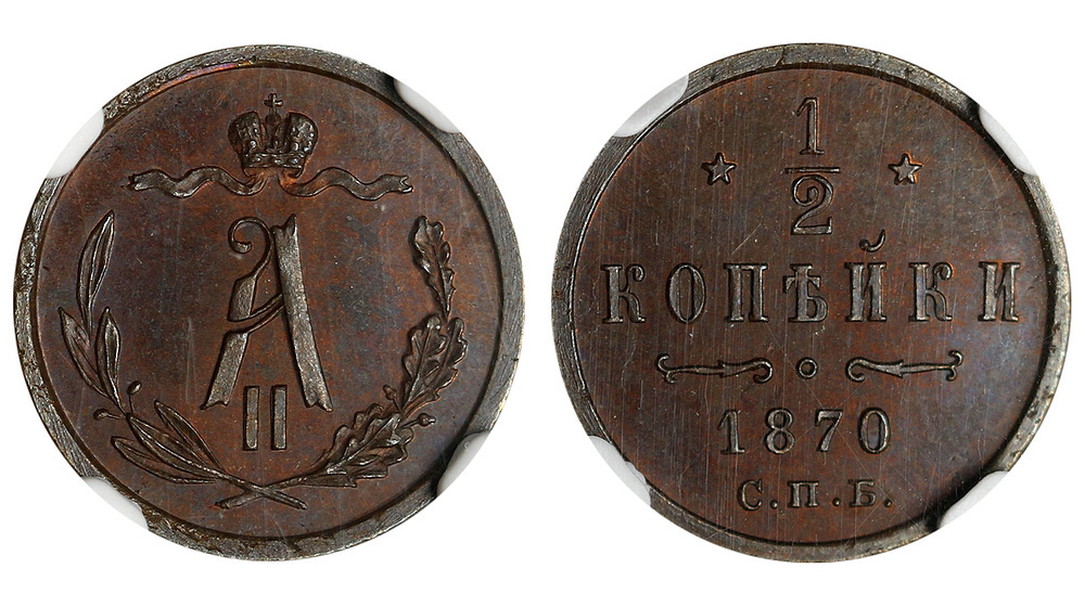 1/2 копейки 1870 года. СПБ. Аукцион: Hermes Состояние: MS65 (UNC) |