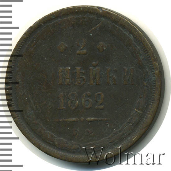В центре указан номинал «2», ограниченный с обеих сторон цветочными розетками. Под цифрой номинала слово — "КОПЕЙКИ", под ним год выпуска монеты «1862.». Ниже, расположен декоративный разделитель в виде двух фигурных линий и небольшой точки между ними. Под разделителем обозначение монетного двора «Е.М.».