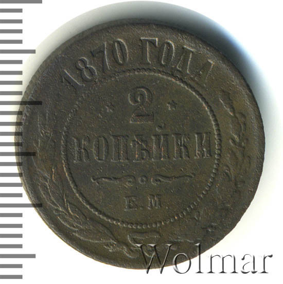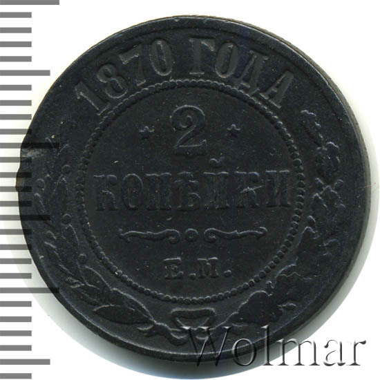 В центре указан номинал «2», ограниченный с обеих сторон звездочками. Под цифрой номинала слово — "КОПЕЙКИ". Ниже, расположен декоративный разделитель в виде двух изогнутых линий и небольшой окружности между ними. Под линиями обозначение монетного двора «Е.М.». Центральная часть отделена от остального изображения, окружностью в виде точек. В верхней части по кругу углубленная надпись: "1870 ГОДА". Ниже этой надписи, вдоль канта, изображен венок из лавровой и дубовой ветви, которые в нижней части перевязаны лентой на узел бантом.