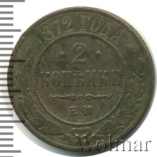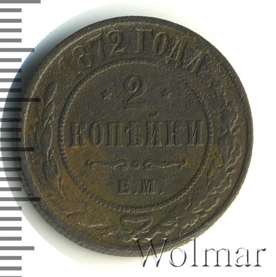 В центре указан номинал «2», ограниченный с обеих сторон звездочками. Под цифрой номинала слово — "КОПЕЙКИ". Ниже, расположен декоративный разделитель в виде двух изогнутых линий и небольшой окружности между ними. Под линиями обозначение монетного двора «Е.М.». Центральная часть отделена от остального изображения, окружностью в виде точек. В верхней части по кругу углубленная надпись: "1872 ГОДА". Ниже этой надписи, вдоль канта, изображен венок из лавровой и дубовой ветви, которые в нижней части перевязаны лентой на узел бантом.