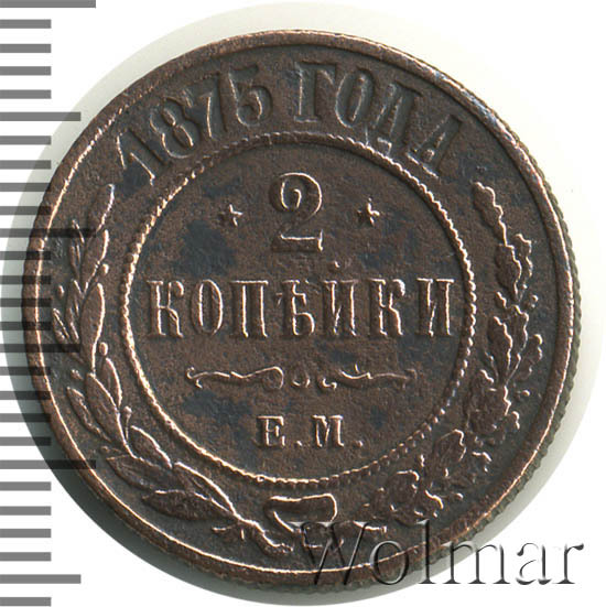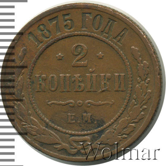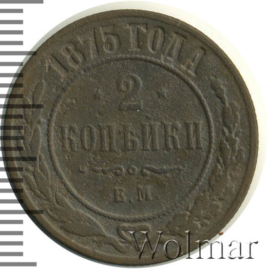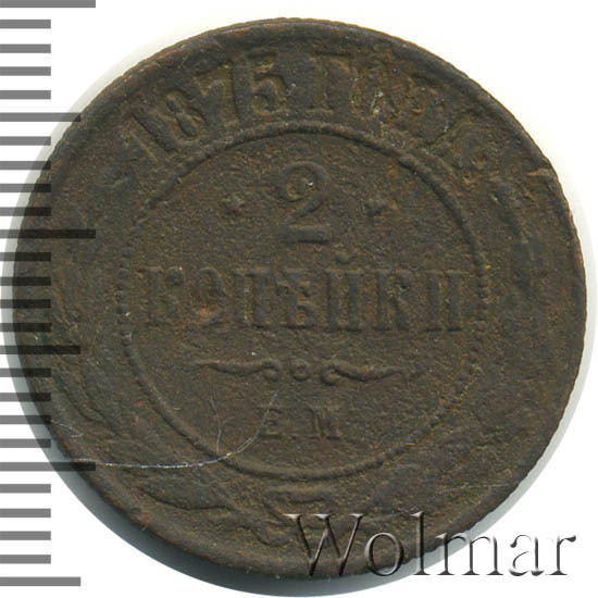 В центре указан номинал «2», ограниченный с обеих сторон звездочками. Под цифрой номинала слово — "КОПЕЙКИ". Ниже, расположен декоративный разделитель в виде двух изогнутых линий и небольшой окружности между ними. Под линиями обозначение монетного двора «Е.М.». Центральная часть отделена от остального изображения, окружностью в виде точек. В верхней части по кругу углубленная надпись: "1875 ГОДА". Ниже этой надписи, вдоль канта, изображен венок из лавровой и дубовой ветви, которые в нижней части перевязаны лентой на узел бантом.