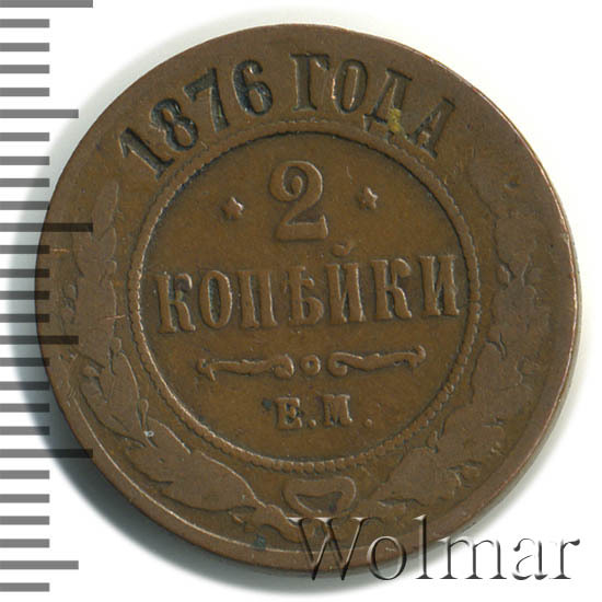 В центре указан номинал «2», ограниченный с обеих сторон звездочками. Под цифрой номинала слово — "КОПЕЙКИ". Ниже, расположен декоративный разделитель в виде двух изогнутых линий и небольшой окружности между ними. Под линиями обозначение монетного двора «Е.М.». Центральная часть отделена от остального изображения, окружностью в виде точек. В верхней части по кругу углубленная надпись: "1876 ГОДА". Ниже этой надписи, вдоль канта, изображен венок из лавровой и дубовой ветви, которые в нижней части перевязаны лентой на узел бантом.
