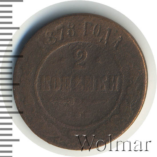 В центре указан номинал «2», ограниченный с обеих сторон звездочками. Под цифрой номинала слово — "КОПЕЙКИ". Ниже, расположен декоративный разделитель в виде двух изогнутых линий и небольшой окружности между ними. Под линиями обозначение монетного двора «С.П.Б.». Центральная часть отделена от остального изображения, окружностью в виде точек. В верхней части по кругу углубленная надпись: "1878 ГОДА". Ниже этой надписи, вдоль канта, изображен венок из лавровой и дубовой ветви, которые в нижней части перевязаны лентой на узел бантом.