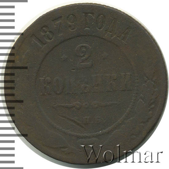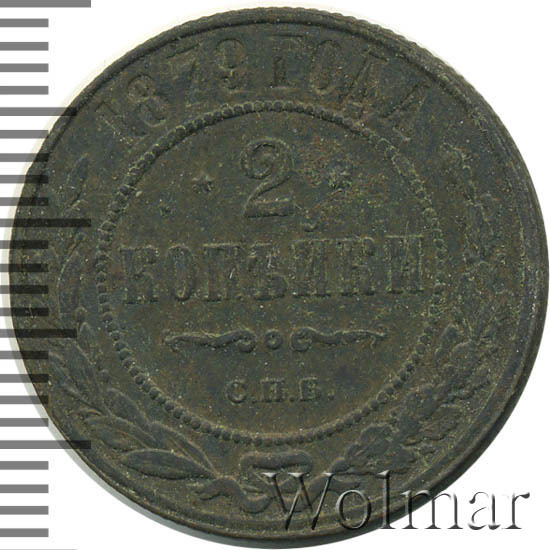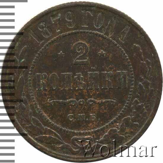 В центре указан номинал «2», ограниченный с обеих сторон звездочками. Под цифрой номинала слово — "КОПЕЙКИ". Ниже, расположен декоративный разделитель в виде двух изогнутых линий и небольшой окружности между ними. Под линиями обозначение монетного двора «С.П.Б.». Центральная часть отделена от остального изображения, окружностью в виде точек. В верхней части по кругу углубленная надпись: "1879 ГОДА". Ниже этой надписи, вдоль канта, изображен венок из лавровой и дубовой ветви, которые в нижней части перевязаны лентой на узел бантом.