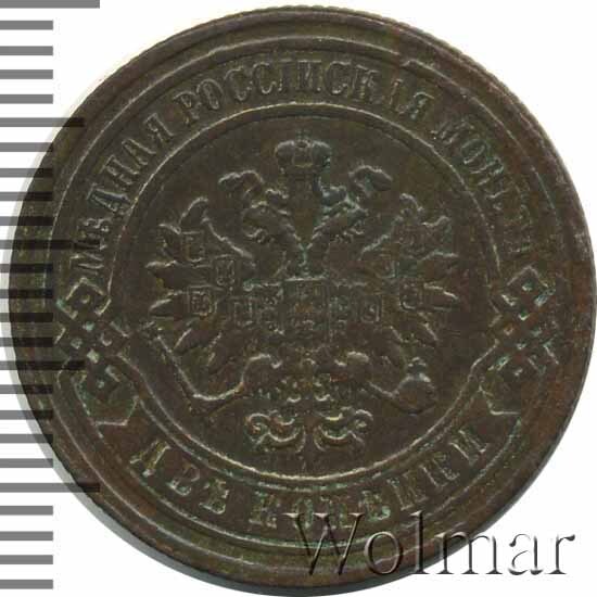 В центре монеты изображен Малый Государственный Герб Российской империи - двуглавый орел, головы которого увенчаны двумя коронами, третья, большая корона над ними. Все они соединены лентой Андрея Первозванного. В правой лапе орла – скипетр, в левой – держава. На его груди расположен Московский герб, в щите изображен Георгий Победоносец с копьем поражающий дракона. Вокруг щита цепь ордена Св. Апостола Андрея Первозванного. На крыльях орла изображены гербы: Царства Казанского, Польского, Херсонеса Таврического, Астраханского, Сибирского, Грузинского и герб соединенных княжеств Киевского, Новгородского и Владимирского — по 4 на каждое крыло. По окружности - две полукруглые плашки, соединенные узорами. На верхней плашке выпуклая надпись: "МЕДНАЯ РОССИЙСКАЯ МОНЕТА". На нижней плашке, изображенной в виде ленты, углубленная надпись: "ДВЕ КОПЕЙКИ".