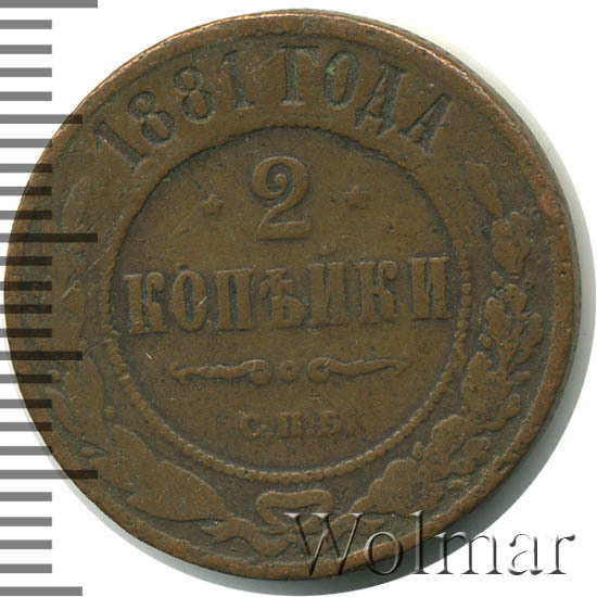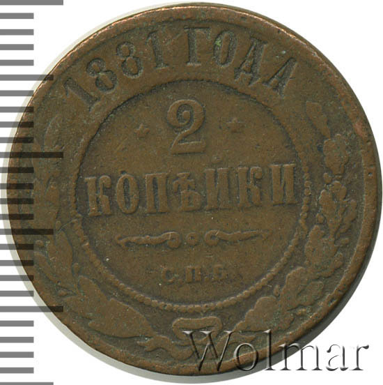 В центре указан номинал «2», ограниченный с обеих сторон звездочками. Под цифрой номинала слово — "КОПЕЙКИ". Ниже, расположен декоративный разделитель в виде двух изогнутых линий и небольшой окружности между ними. Под линиями обозначение монетного двора «С.П.Б.». Центральная часть отделена от остального изображения, окружностью в виде точек. В верхней части по кругу углубленная надпись: "1881 ГОДА". Ниже этой надписи, вдоль канта, изображен венок из лавровой и дубовой ветви, которые в нижней части перевязаны лентой на узел бантом.