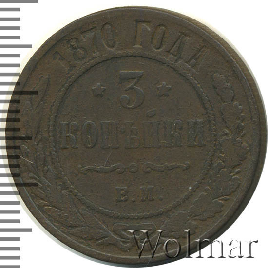 В центре указан номинал «3», ограниченный с обеих сторон звездочками. Под цифрой номинала слово — "КОПЕЙКИ". Ниже, расположен декоративный разделитель в виде двух изогнутых линий и небольшой окружности между ними. Под линиями обозначение монетного двора «Е.М.». Центральная часть отделена от остального изображения, окружностью в виде точек. В верхней части по кругу углубленная надпись: "1870 ГОДА". Ниже этой надписи, вдоль канта, изображен венок из лавровой и дубовой ветви, которые в нижней части перевязаны лентой на узел бантом.