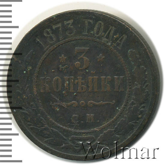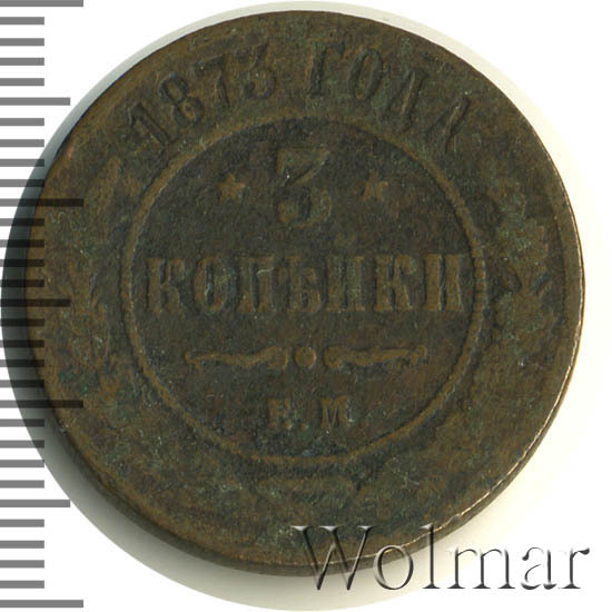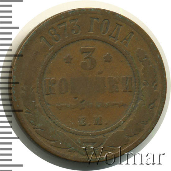 В центре указан номинал «3», ограниченный с обеих сторон звездочками. Под цифрой номинала слово — "КОПЕЙКИ". Ниже, расположен декоративный разделитель в виде двух изогнутых линий и небольшой окружности между ними. Под линиями обозначение монетного двора «Е.М.». Центральная часть отделена от остального изображения, окружностью в виде точек. В верхней части по кругу углубленная надпись: "1873 ГОДА". Ниже этой надписи, вдоль канта, изображен венок из лавровой и дубовой ветви, которые в нижней части перевязаны лентой на узел бантом.