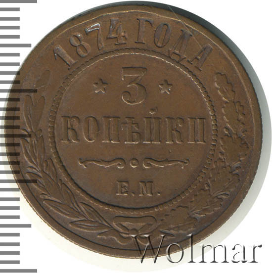 В центре указан номинал «3», ограниченный с обеих сторон звездочками. Под цифрой номинала слово — "КОПЕЙКИ". Ниже, расположен декоративный разделитель в виде двух изогнутых линий и небольшой окружности между ними. Под линиями обозначение монетного двора «Е.М.». Центральная часть отделена от остального изображения, окружностью в виде точек. В верхней части по кругу углубленная надпись: "1874 ГОДА". Ниже этой надписи, вдоль канта, изображен венок из лавровой и дубовой ветви, которые в нижней части перевязаны лентой на узел бантом.