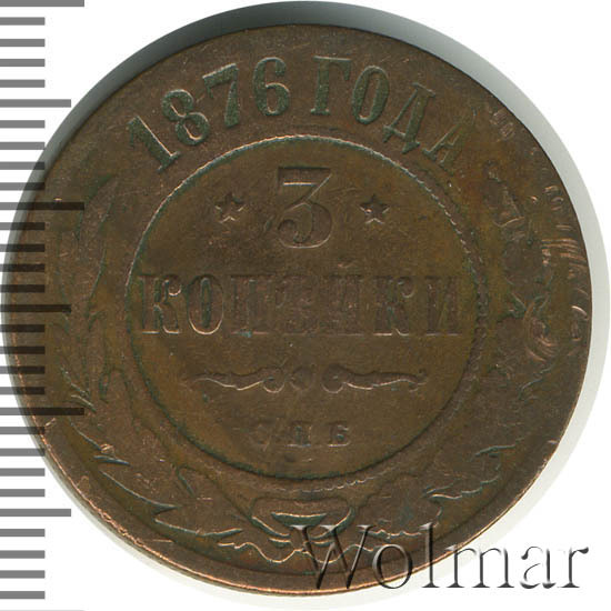 В центре указан номинал «3», ограниченный с обеих сторон звездочками. Под цифрой номинала слово — "КОПЕЙКИ". Ниже, расположен декоративный разделитель в виде двух изогнутых линий и небольшой окружности между ними. Под линиями обозначение монетного двора «С.П.Б.». Центральная часть отделена от остального изображения, окружностью в виде точек. В верхней части по кругу углубленная надпись: "1876 ГОДА". Ниже этой надписи, вдоль канта, изображен венок из лавровой и дубовой ветви, которые в нижней части перевязаны лентой на узел бантом.