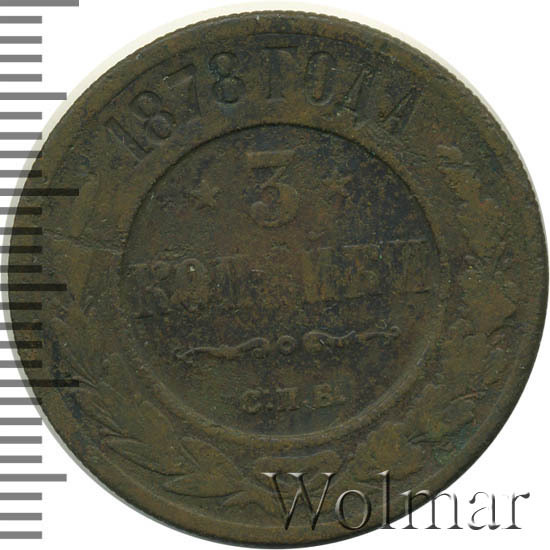 В центре указан номинал «3», ограниченный с обеих сторон звездочками. Под цифрой номинала слово — "КОПЕЙКИ". Ниже, расположен декоративный разделитель в виде двух изогнутых линий и небольшой окружности между ними. Под линиями обозначение монетного двора «С.П.Б.». Центральная часть отделена от остального изображения, окружностью в виде точек. В верхней части по кругу углубленная надпись: "1878 ГОДА". Ниже этой надписи, вдоль канта, изображен венок из лавровой и дубовой ветви, которые в нижней части перевязаны лентой на узел бантом.