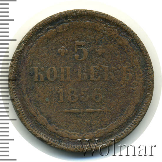 В центре указан номинал «5», ограниченный с обеих сторон цветочными розетками. Под цифрой номинала — слово "КОПЕЕК", под ним год выпуска монеты «1856.». Ниже, расположен декоративный разделитель в виде двух фигурных линий и небольшой точки между ними. Под разделителем обозначение монетного двора «В.М.».