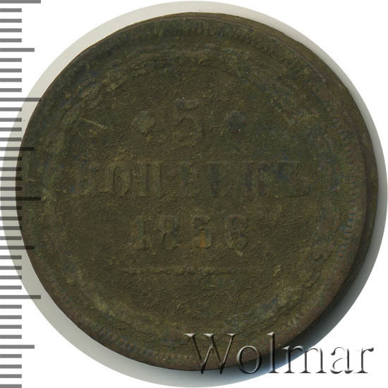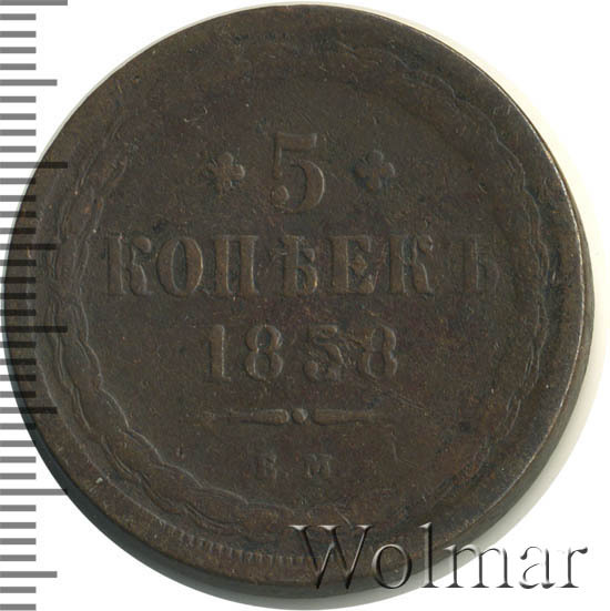 В центре указан номинал «5», ограниченный с обеих сторон цветочными розетками. Под цифрой номинала — слово "КОПЕЕК", под ним год выпуска монеты «1858.». Ниже, расположен декоративный разделитель в виде двух фигурных линий и небольшой точки между ними. Под разделителем обозначение монетного двора «Е.М.».