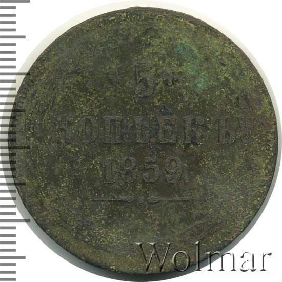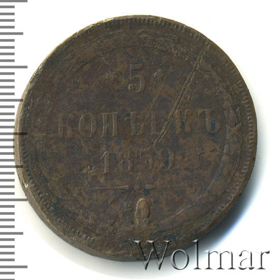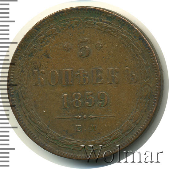 В центре указан номинал «5», ограниченный с обеих сторон цветочными розетками. Под цифрой номинала — слово "КОПЕЕК", под ним год выпуска монеты «1859.». Ниже, расположен декоративный разделитель в виде двух фигурных линий и небольшой точки между ними. Под разделителем обозначение монетного двора «Е.М.».