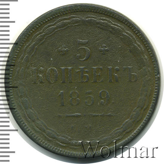 В центре указан номинал «5», ограниченный с обеих сторон цветочными розетками. Под цифрой номинала — слово "КОПЕЕК", под ним год выпуска монеты «1859.». Ниже, расположен декоративный разделитель в виде двух фигурных линий и небольшой точки между ними. Под разделителем обозначение монетного двора «Е.М.».